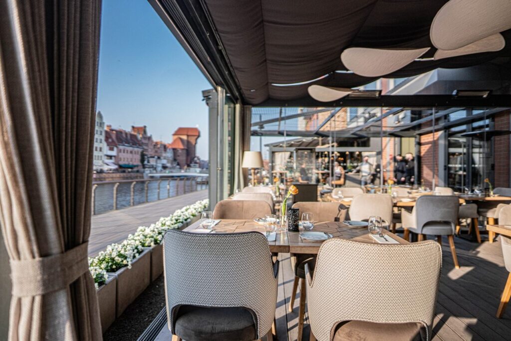 Our sunny terrace is our pride and joy – a place with stunning views of the Motława River and the monuments that have defined Gdańsk for centuries. Thanks to the glass conservatory, retractable roof, and heating system, we can ensure our guests’ comfort regardless of the weather. The Gdańsk panorama becomes the perfect backdrop for enjoying our dishes.